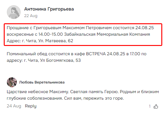Скриншот сообщения о гибели