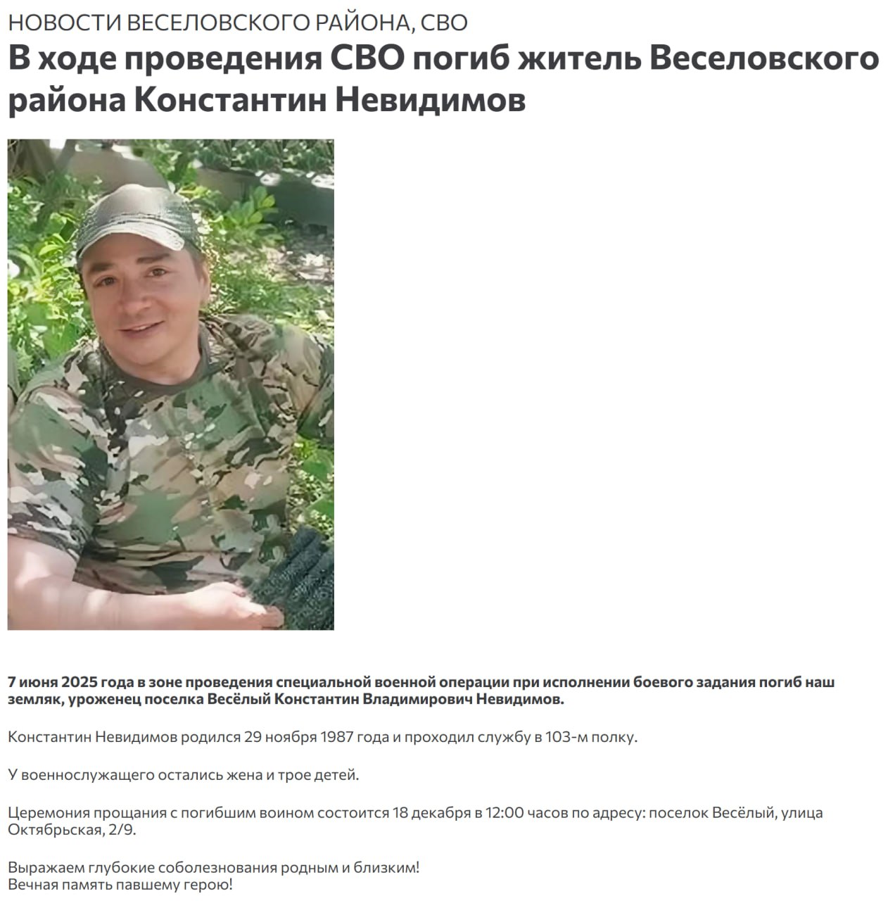Дата сообщения о гибели: