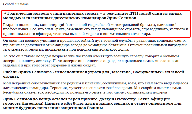 Полковник Эрик Селимов и трое его подчиненных погибли в результате ДТП, устроенного пьяными солдатами 88 бригады РФ.