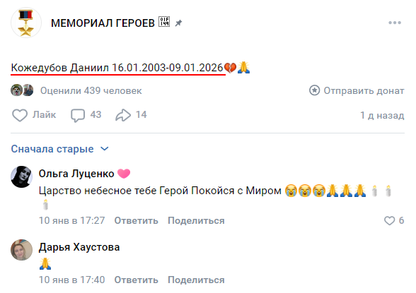 Скриншот сообщения о гибели