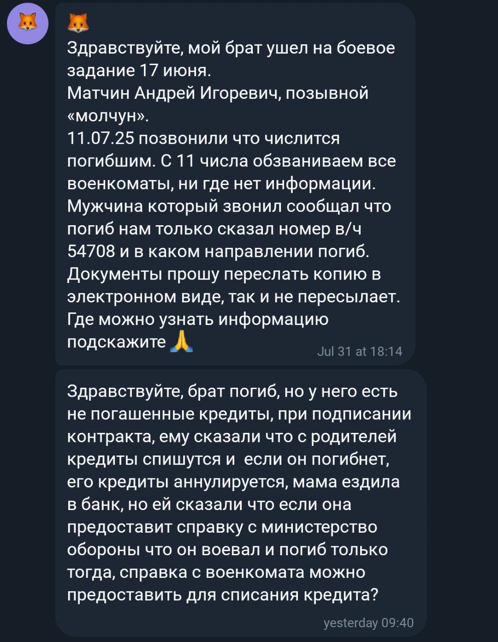Скриншот сообщения о гибели