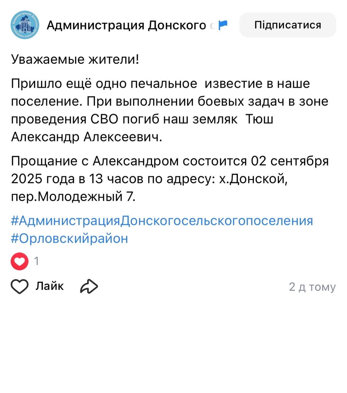 Дата сообщения о гибели: