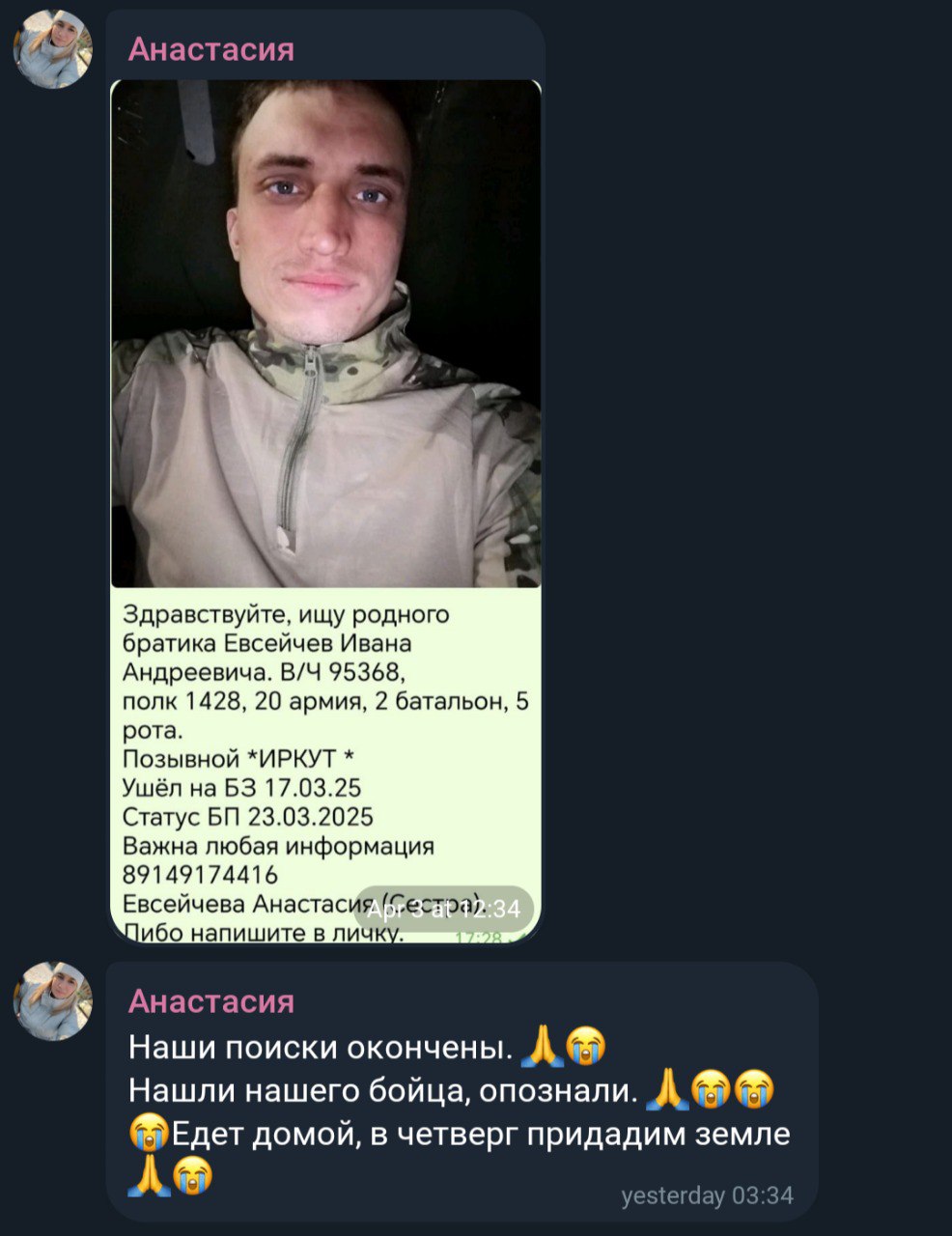 Дата сообщения о гибели: