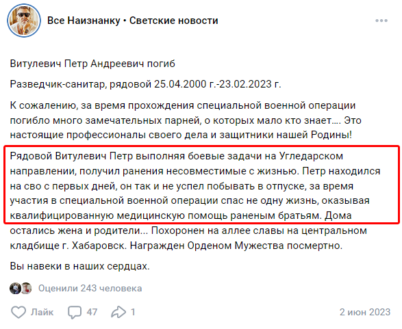 Скриншот сообщения о гибели