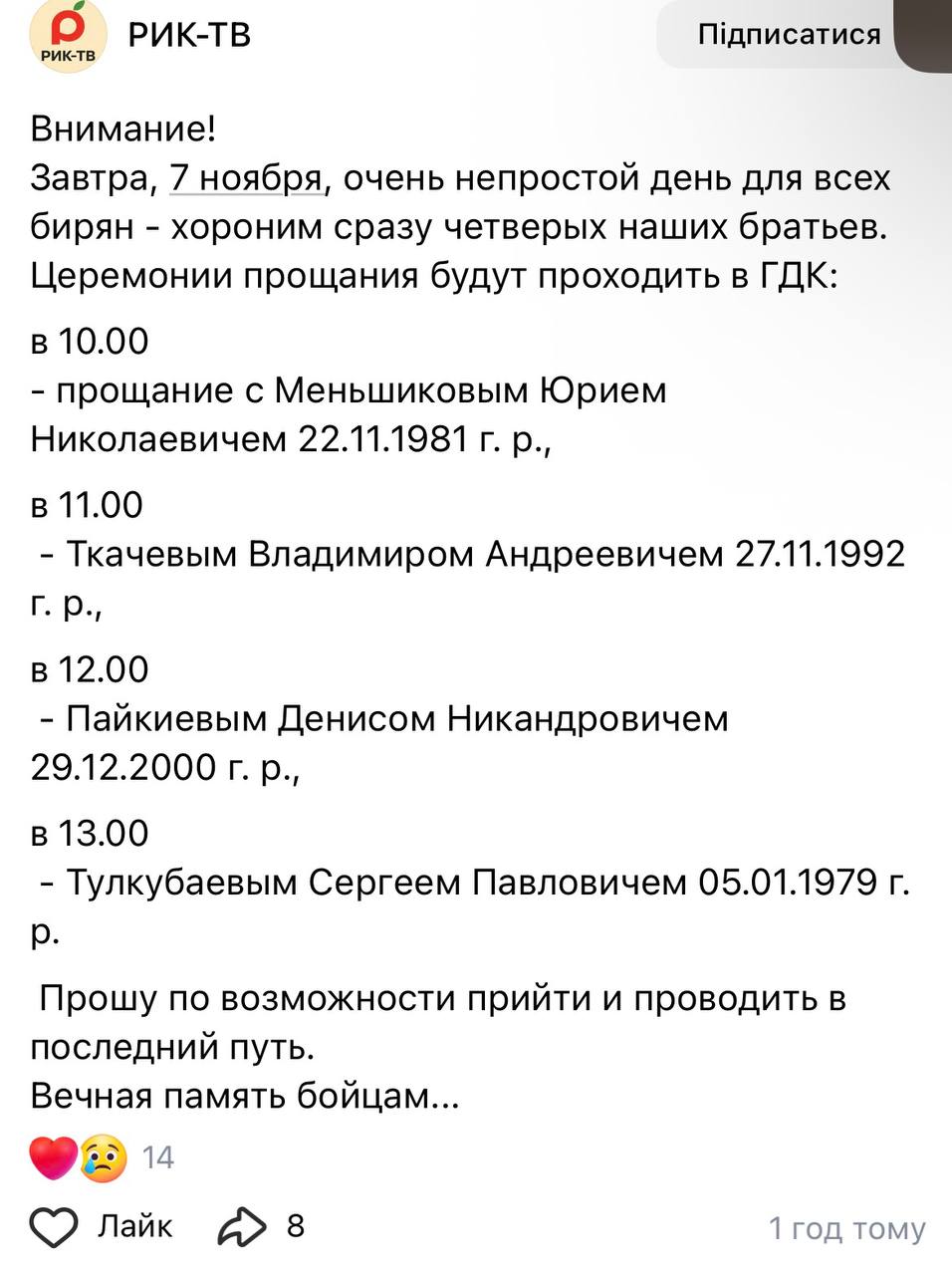 Дата сообщения о гибели: