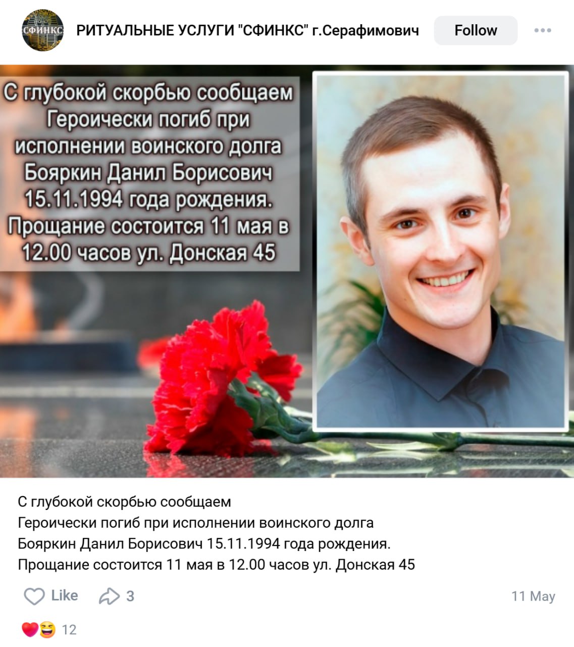Дата сообщения о гибели: