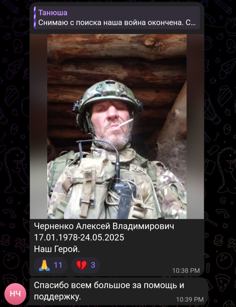 Скриншот сообщения о гибели