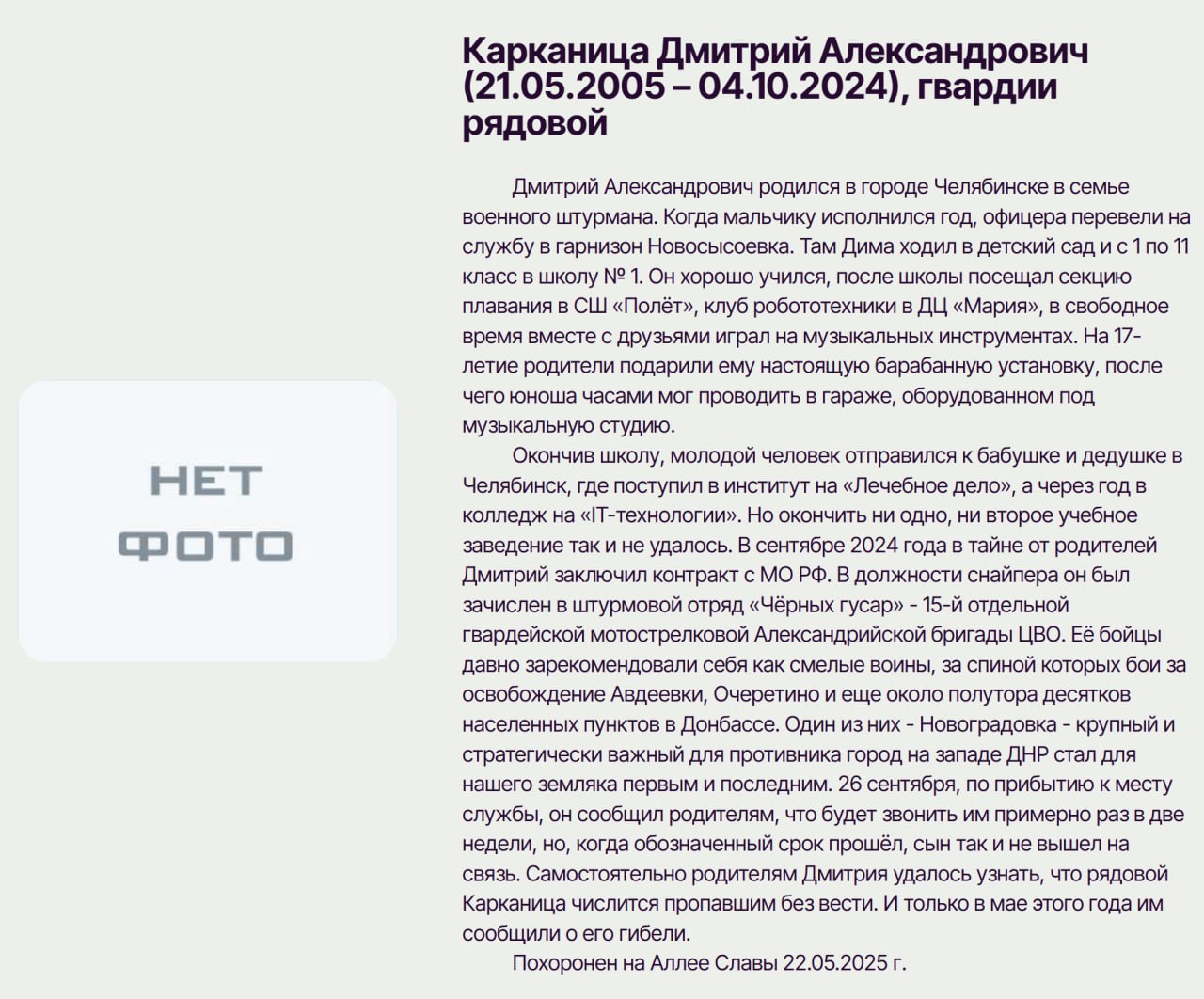Дата сообщения о гибели: