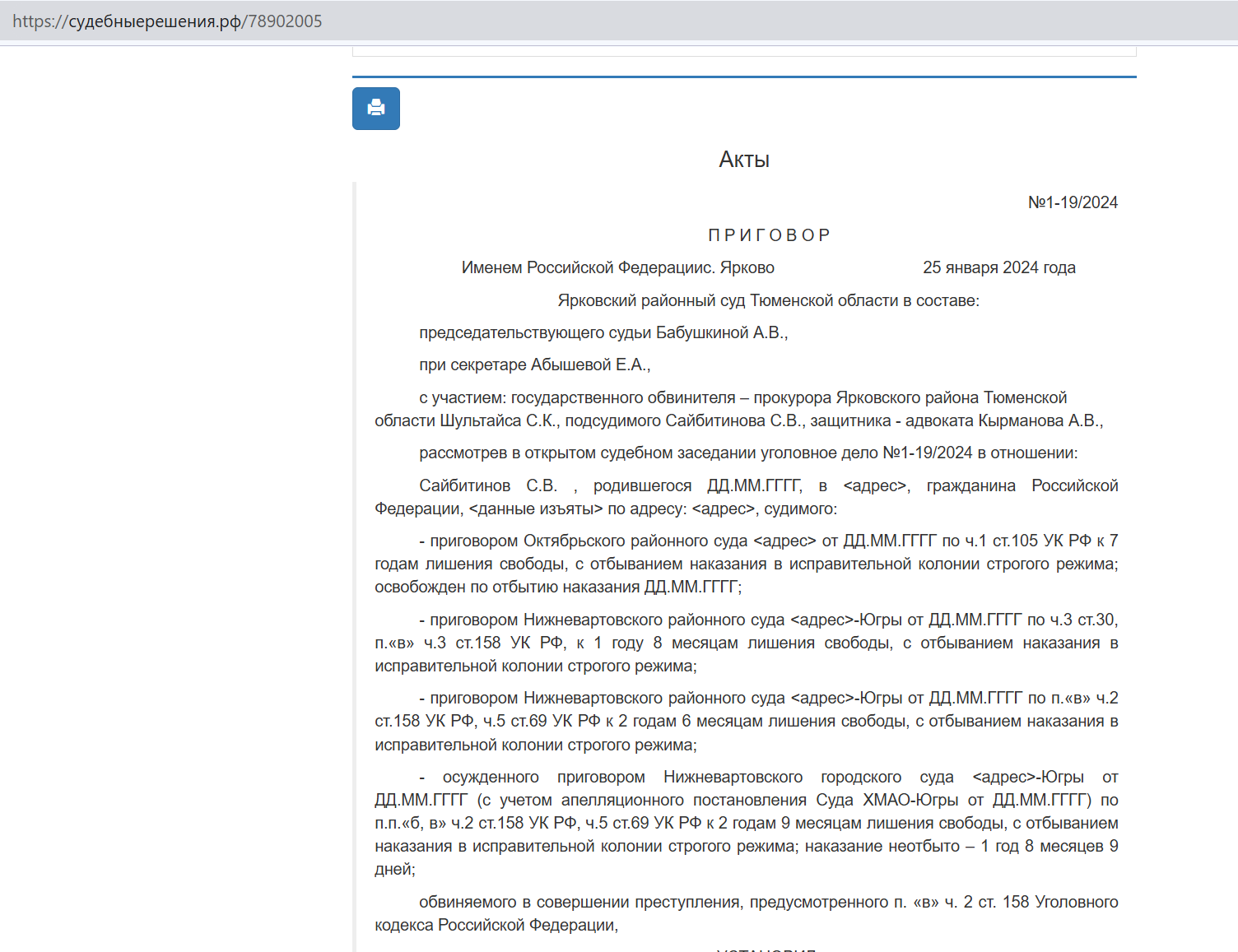 Осужден по ст 158 УК РФ за кражу. Ранее отсидел по ст 105 УК РФ за убийство. https://xn--90afdbaav0bd1afy6eub5d.xn--p1ai/78902005